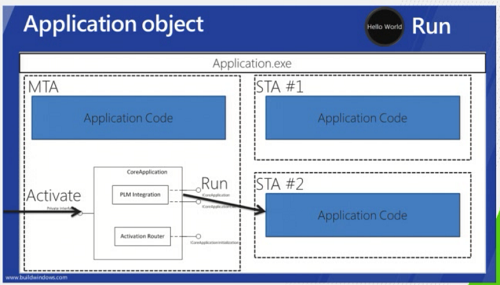 看了這篇 Windows Runtime internals: understanding "Hello World" article 我才恍然大悟, Threading model 是存在的, 只不過 WinRT 隱藏了這些細節, WinRT 有一個預設的 Win32 exe 也就是 WWAHost.exe ,它被用來 host Metro style application. WWAHost.exe 也就是 application 的 Server, 以我所了解, host 可以是別的 exe, 這些資訊會被記錄在HKEY_CURRENT_USER\Software\Classes\ActivatableClasses\Server\XXX\ExePath. 根據我對這篇 article 的了解, WWAHost.exe 的第一個 thread 會是 MTA, 這個 thread 被用來做為 activation 之用. 所以 WWAHost!Host::Run 會去執行twinapi!Windows::ApplicationModel::Core::CoreApplicationFactory::RunWithBackgroundFactory 並且等待新的 activation request. 當新的 request 進來時, 它會 fork 一個新的 STA thread 並且執行 request 的需求. 這個需求可能任何一種 Contract ex: Launch, Search, BackgroundTasks ....